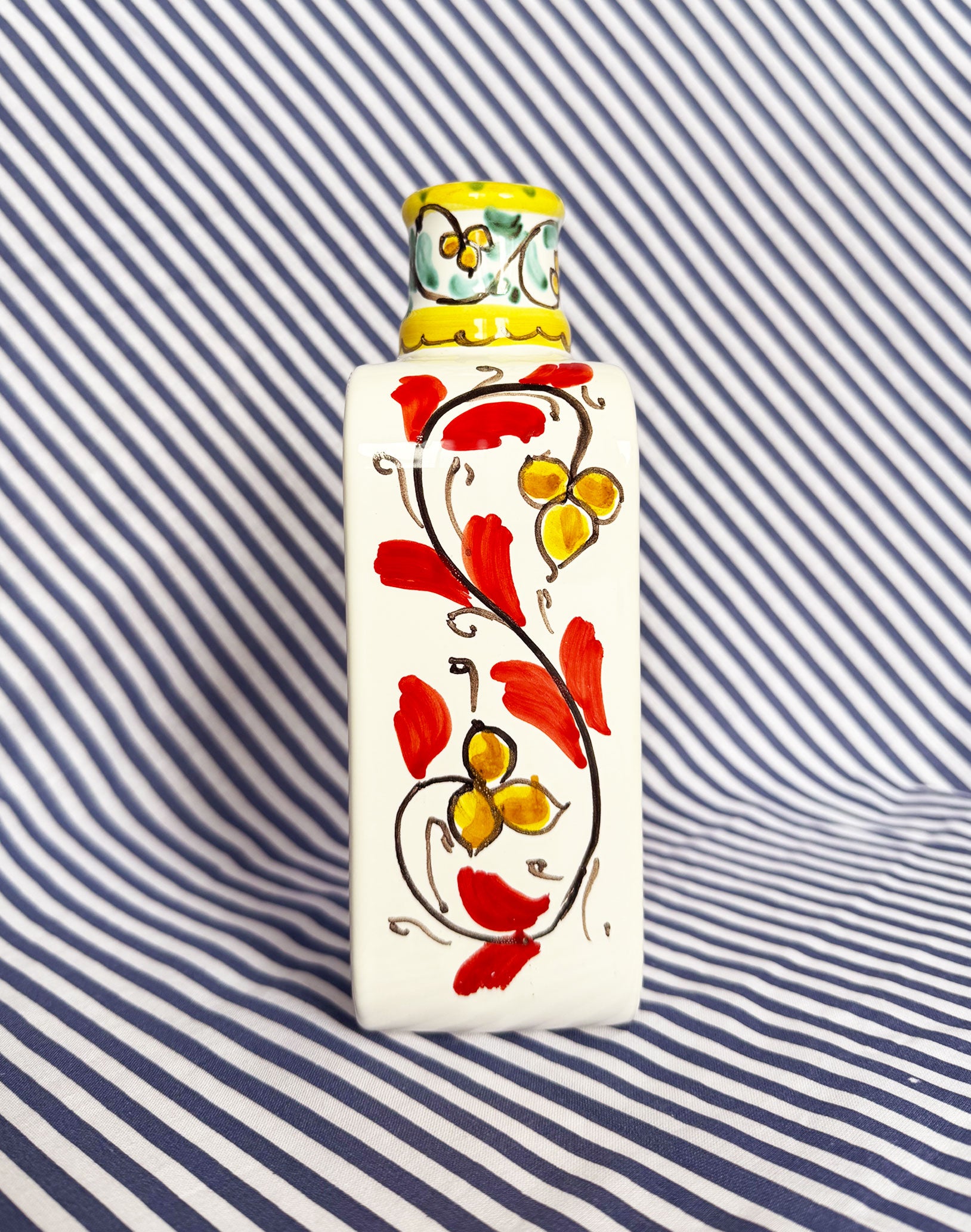 This cutie patootie is your new tavolo (table) bestie and it will absolutely detract attention from everything else on the table. Hand-painted in Sciacca, Sicily, this rectangular ceramic vessel sits so comfortably in the hand and features an unmissable pomegranate (melograno) motif on both sides. Aqua blue vines dance around the sides and spout, the perfect accompaniment to this artisanal piece.