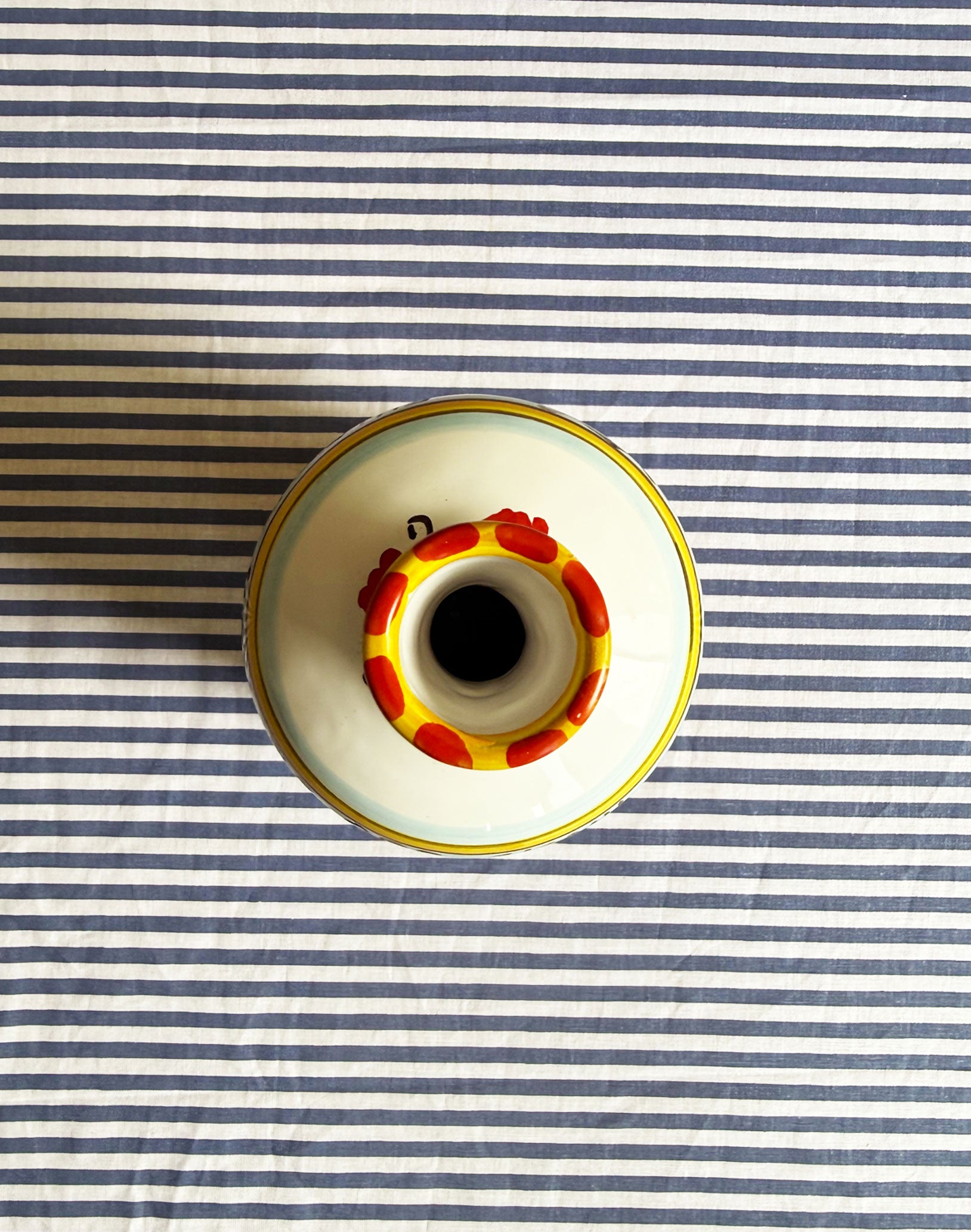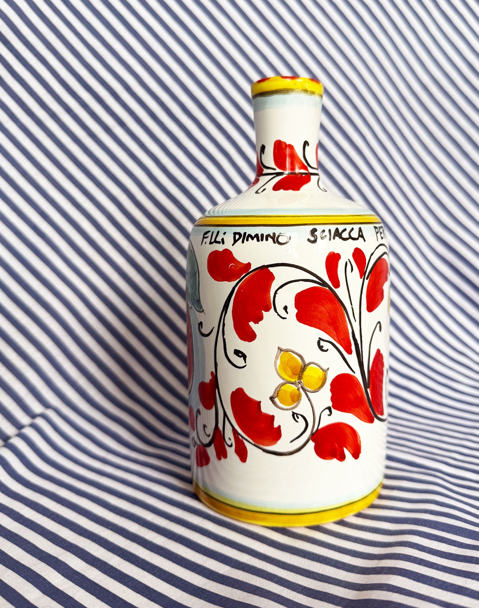 What. A. Stunner. There’s no ignoring this majestic beauty. Expect endless compliments about this hand-painted Sicilian olive oil bottle who harks all the way from Sciacca. Exotic and eye-catching, the bold pomegranate (melograno) crest is a lesser-known motif of Sicily because the climate is perfect for them to grow. Crimson red (rosso) vines abundantly wrap around this hand-made vessel that is topped with a sun-yellow spout. Now the real question is: Why are you still reading this? Vai, vai, bring her home with you before somebody else does!
